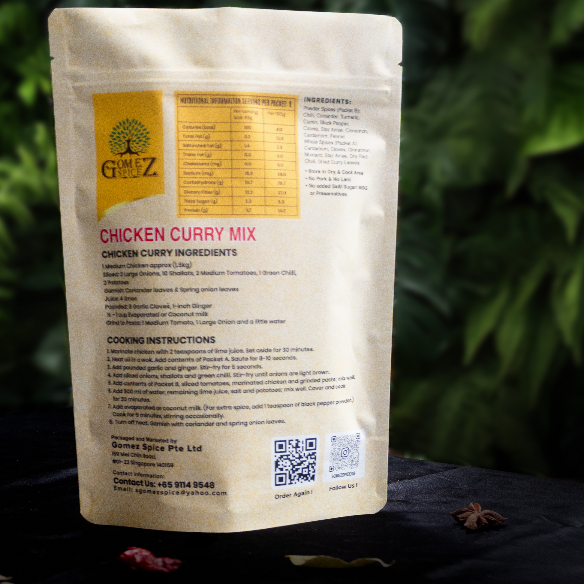 Bring the authentic taste of Singaporean cuisine to your kitchen with Gomez Spice Chicken Curry Mix! Our expertly blended mix of aromatic spices is incredibly versatile, perfect for creating rich and flavorful chicken curry, as well as delicious marinades, sauces, and other culinary creations. Forget complicated recipes and measuring individual spices – each packet serves 4-8 people (depending on usage) and includes easy-to-follow instructions and usage suggestions. Whether you're a seasoned chef or a beginner, our Chicken Curry Mix makes adding authentic Singaporean flavor to your cooking a breeze. Perfect for busy weeknights, family dinners, meal prepping, or adding a touch of magic to any chicken dish.