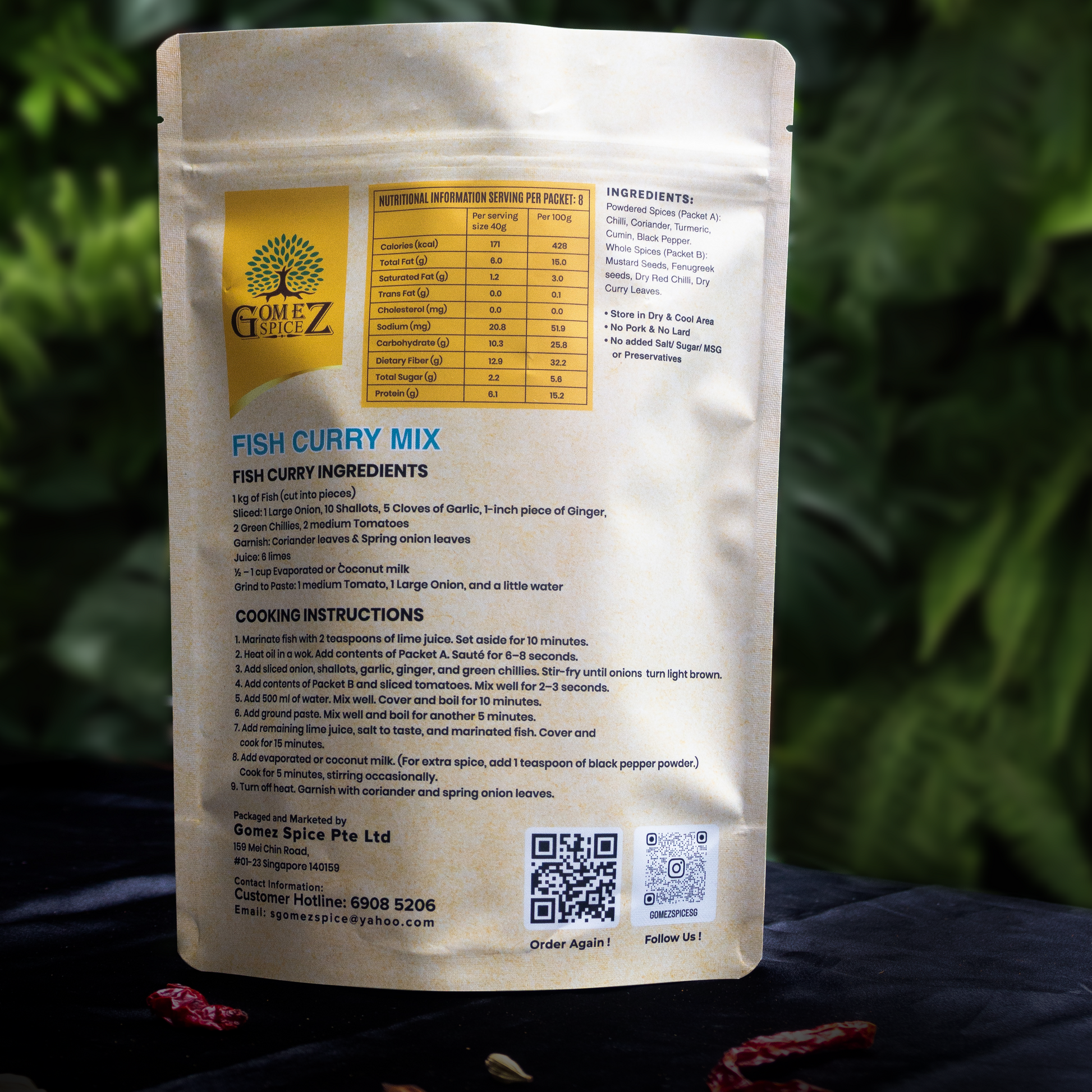 Embark on a flavorful journey with Gomez Spice Fish Curry Mix! Our expertly blended mix of fragrant spices brings the authentic taste of Singaporean fish curry to your kitchen. Inspired by traditional fish curry recipes, our blend creates a tender and unforgettable culinary experience. Forget complicated recipes and measuring individual spices – each packet serves 4-8 people and includes easy-to-follow instructions for a restaurant-quality meal in minutes. Whether you're a seasoned chef or a beginner, our Fish Curry Mix makes cooking a delicious and authentic fish curry a breeze. Perfect for busy weeknights, family dinners, or meal prepping.